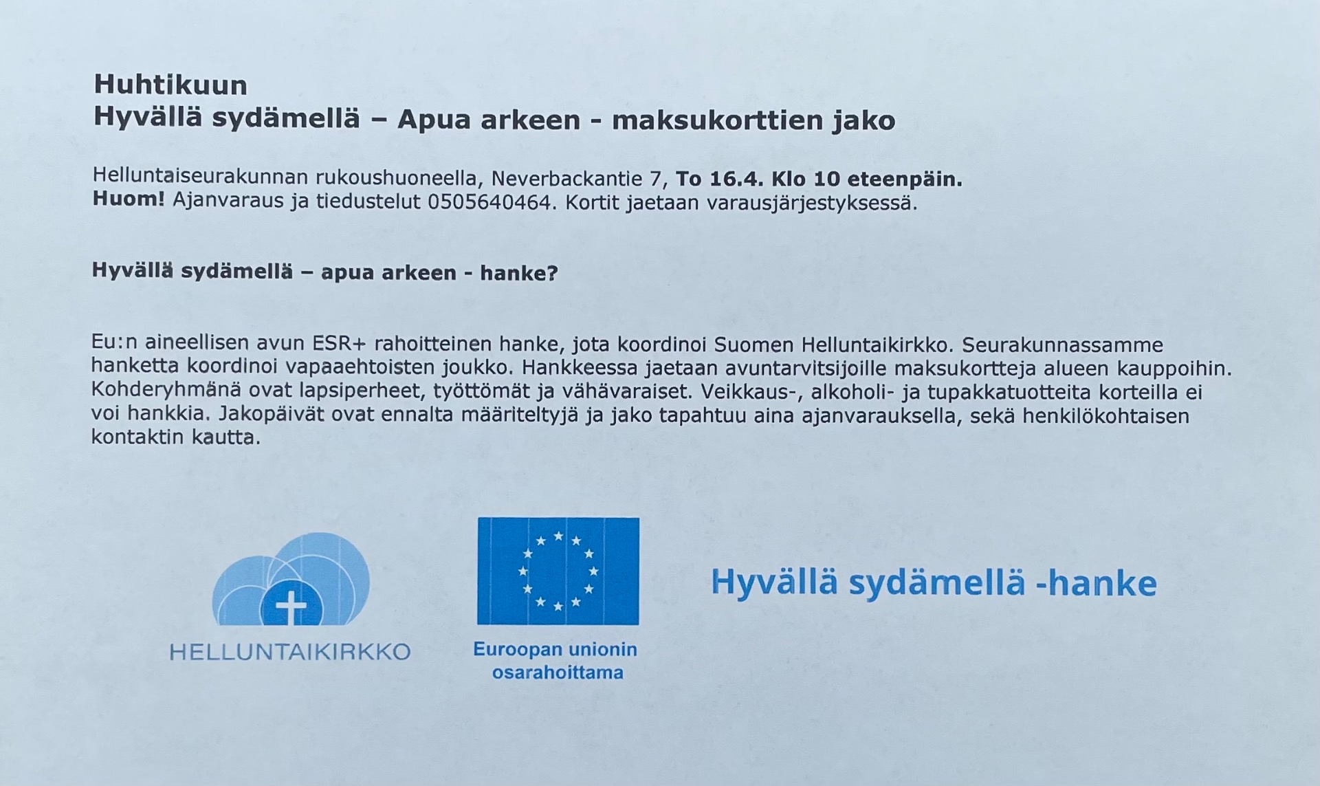 Alta löydät tulevat tilaisuudet sekä seurakunnan yhteystiedot. Tulevien tapahtumien mainoskuvat sekä viimeisimmän jumalanpalveluksen videotallenne ovat nähtävissä Ajankohtaista-sivulla.